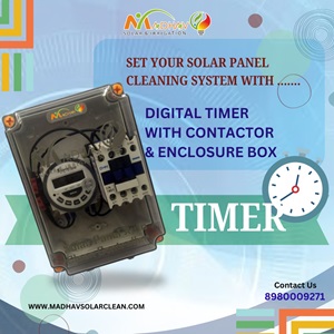 Madhav Solar & Irrigation Want to know about Digital Timer with Contactor & Enclosure Box for Automatic Solar Panel Cleaning * It is important to understand the ingredients > Digital Timer: This is the brains of the operation. It allows you to program when your solar panel cleaning system turns on and off. You can set specific times of day and days of the week for cleaning. > Contactor: This is a heavy-duty electrical switch that is controlled by the digital timer. It handles the higher voltage and current needed to power your cleaning system's pump or other components. > Enclosure Box: This is a protective case that houses the digital timer and contactor. It's typically weatherproof to protect the components from the elements. ( Wiring ) > Power Supply: Connect the power supply to the enclosure box, ensuring it's properly grounded. > Timer to Contactor: Wire the digital timer to the contactor's control circuit. This will allow the timer to switch the contactor on and off. > Contactor to Pump: Connect the contactor's output to the pump or other cleaning system components. > Timer Programming: Program the digital timer with your desired cleaning schedule. Installation: Mounting: Mount the enclosure box in a convenient location, ideally close to the power source and the cleaning system components. Connections: Ensure all wiring connections are secure and weatherproof. ( Testing) > Manual Test: Manually activate the cleaning system to ensure it's working correctly. > Weatherproofing: Ensure the enclosure box is weatherproof to protect the components from rain, snow, and other elements. > Timer Features: Consider features like multiple on/off cycles, day/week programming, and manual override when choosing a digital timer. Digital Timer With Contactor & Enclosure Box Digital Timer With Contactor & Enclosure Box in India Digital Timer With Contactor & Enclosure Box in Rajkot Digital Timer With Contactor & Enclosure Box in Tamil Nadu Digital Timer With Contactor & Enclosure Box in Karnataka Digital Timer With Contactor & Enclosure Box in Haryana Digital Timer With Contactor & Enclosure Box in Jharkhand Digital Timer With Contactor & Enclosure Box in Uttar Pradesh Digital Timer With Contactor & Enclosure Box in Madhya Pradesh Digital Timer With Contactor & Enclosure Box in Delhi Digital Timer With Contactor & Enclosure Box in Rajasthan Digital Timer With Contactor & Enclosure Box in Surat Digital Timer With Contactor & Enclosure Box in Ahmadabad